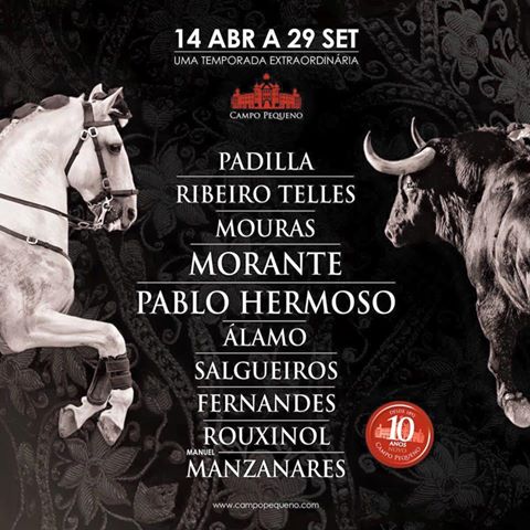 A 19 de Maio comemoram-se dez anos sobre a reinauguração do Campo Pequeno, repetindo-se o cartel dessa data histórica. Em praça estarão os cavaleiros João Moura, António Telles e Rui Fernandes e os grupos de forcados amadores de Santarém e de Lisboa, capitaneados respectivamente por António Vacas de Carvalho e Pedro Maria Gomes, lidando-se toiros de Mário e Herdeiros de Manuel Vinhas.